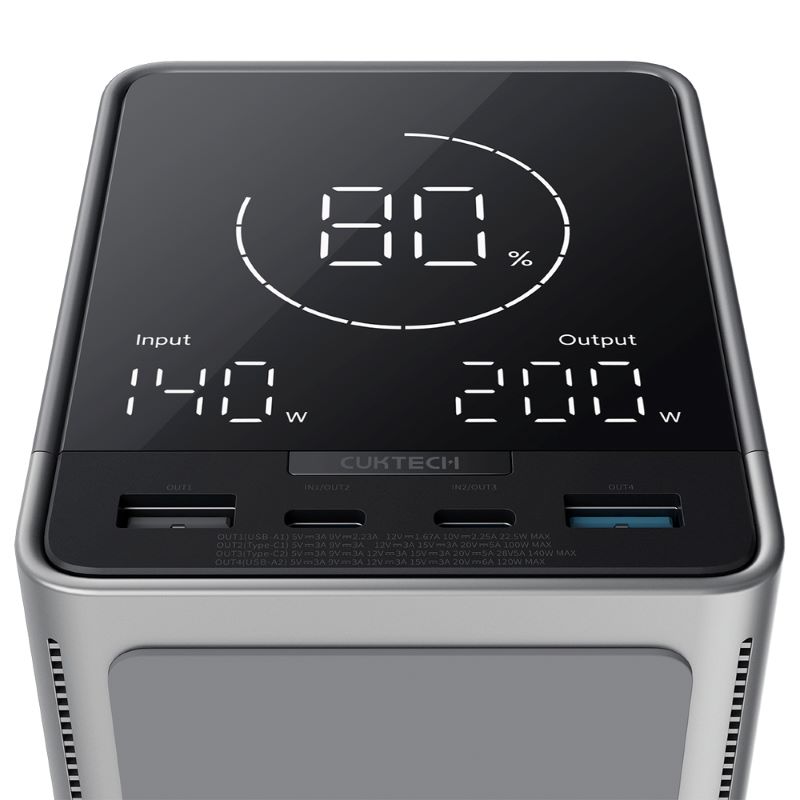 Power bank-ul Cuktech P01CT 300W 40.000 mAh este o sursa avansata de energie, cu o capacitate foarte mare, conceputa pentru a alimenta mai multe dispozitive simultan. Cu o putere de iesire de pana la 300W si suport pentru incarcare rapida de pana la 140W, este ideal pentru smartphone-uri, laptopuri si echipamente foto. Echipat cu patru porturi si incarcare wireless, permite alimentarea mai multor dispozitive in acelasi timp. Designul robust, prevazut cu maner, il face usor de transportat, iar afisajul integrat iti permite sa monitorizezi permanent parametrii de functionare. Este o solutie practica pentru munca mobila, calatorii si utilizare in aer liber.